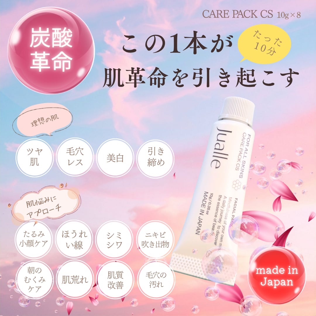 塗布するだけで皮膚の水分と反応してCO2を発生させる世界初の技術を持った炭酸パック。